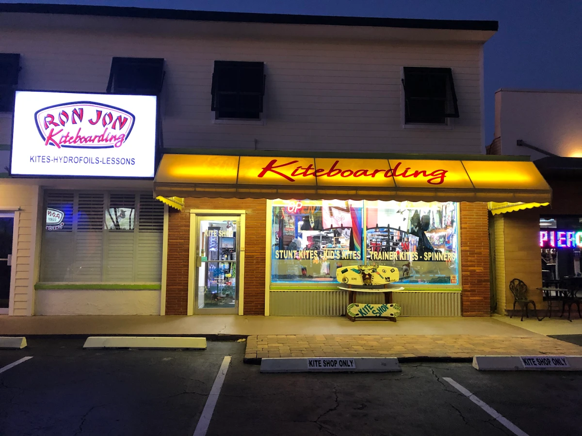 Ron Jon Kiteboarding is a full-service kite shop and school located in Cocoa Beach, Florida. They offer kiteboarding lessons, a wide selection of kiteboarding gear including kites, boards, and hydrofoils, and also provide equipment repairs. The company specializes in water sports instruction, including e-foil and hydrofoil lessons, serving beginners to experienced riders.